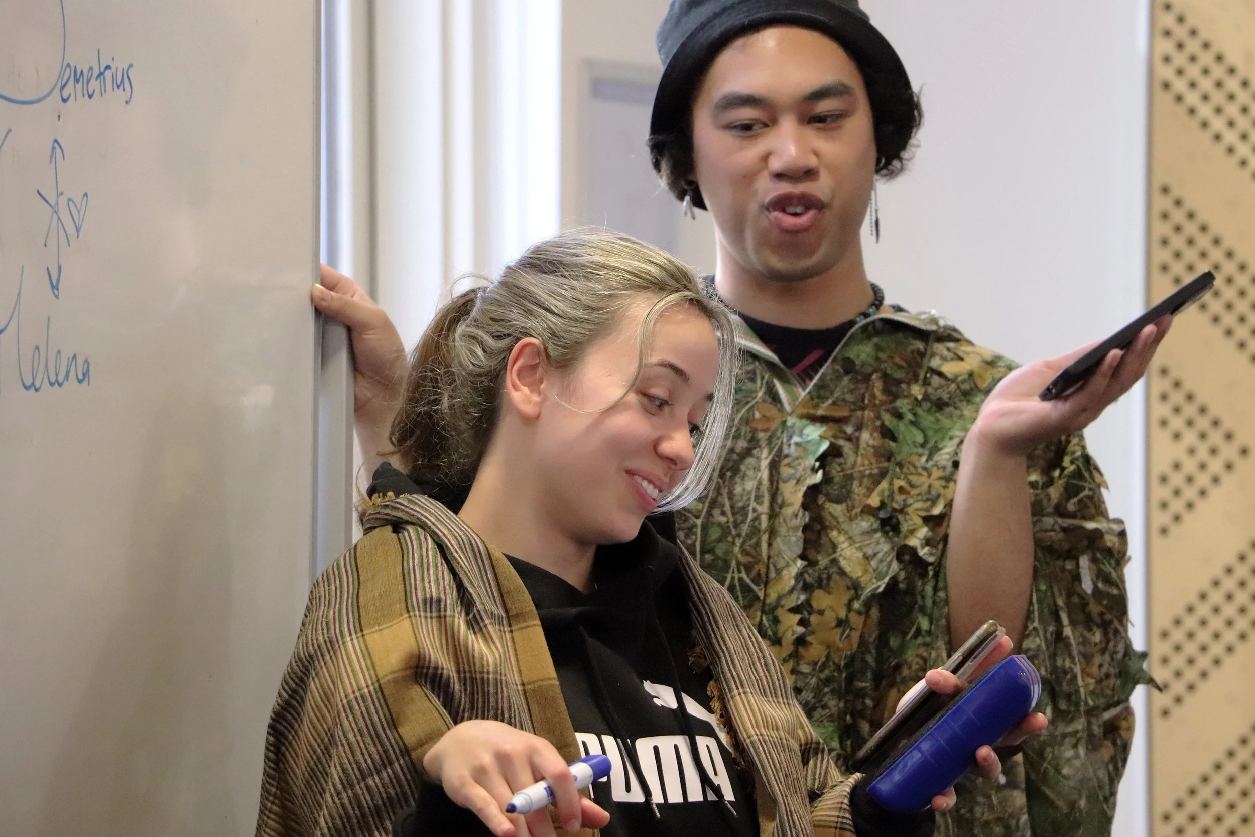 This week, our team of devisers spent the workshop collaborating, composing, and constructing scenes in duos and trios from a list of scene prompts: Three Weird Sisters recount the story of a feuding Fairy King and Queen; a lost hero is challenged to a game of riddles by a tricksy Greek God; Dryads attempt to cheer up a miserable monster with tales of ever worse woe; Hades meets a lovelorn Helena in the middle of an enchanted woods.